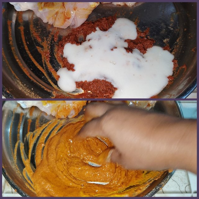 I added the sour yogurt to the mixed spices. Again, I mixed everything for quite a long time.