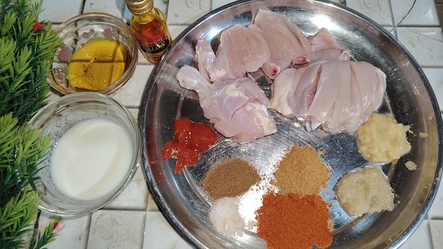 IngredientsQuantityChicken pieces3Yogurt2 tbsGinger paste1/2 tbspGarlic paste1/2 tbspCumin powder1/2 tspRed chili powder1 tbsBarbequr Spice1 tbspSalt1/2 tspYellow food color¼ tspRed chilli sauce1 tspOil1 tsp