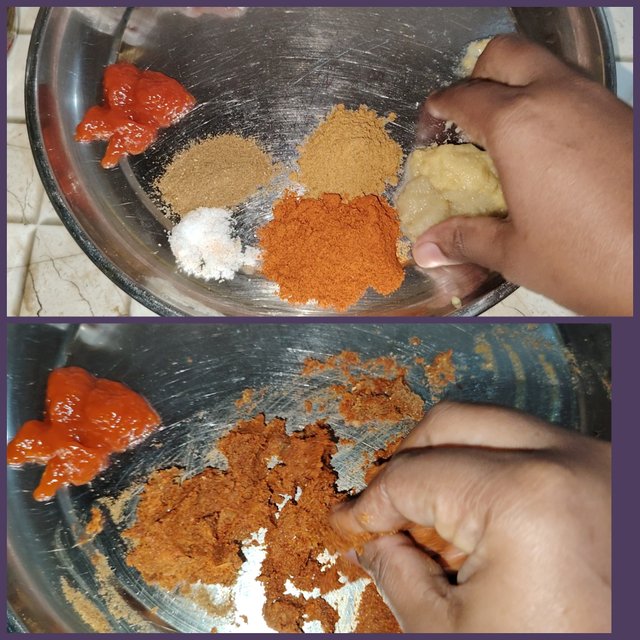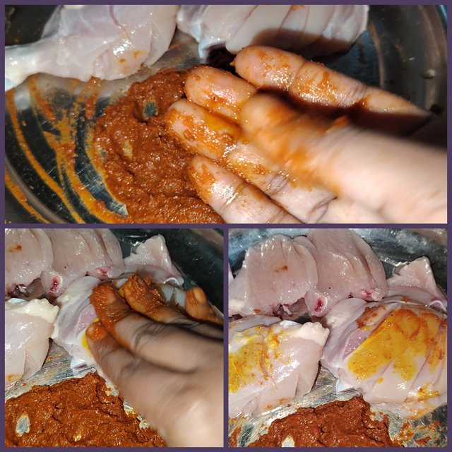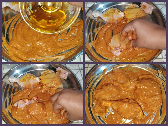 At this point, I added oil to the spices. Mix well, rub all the chicken pieces well and leave to marinate for a while.