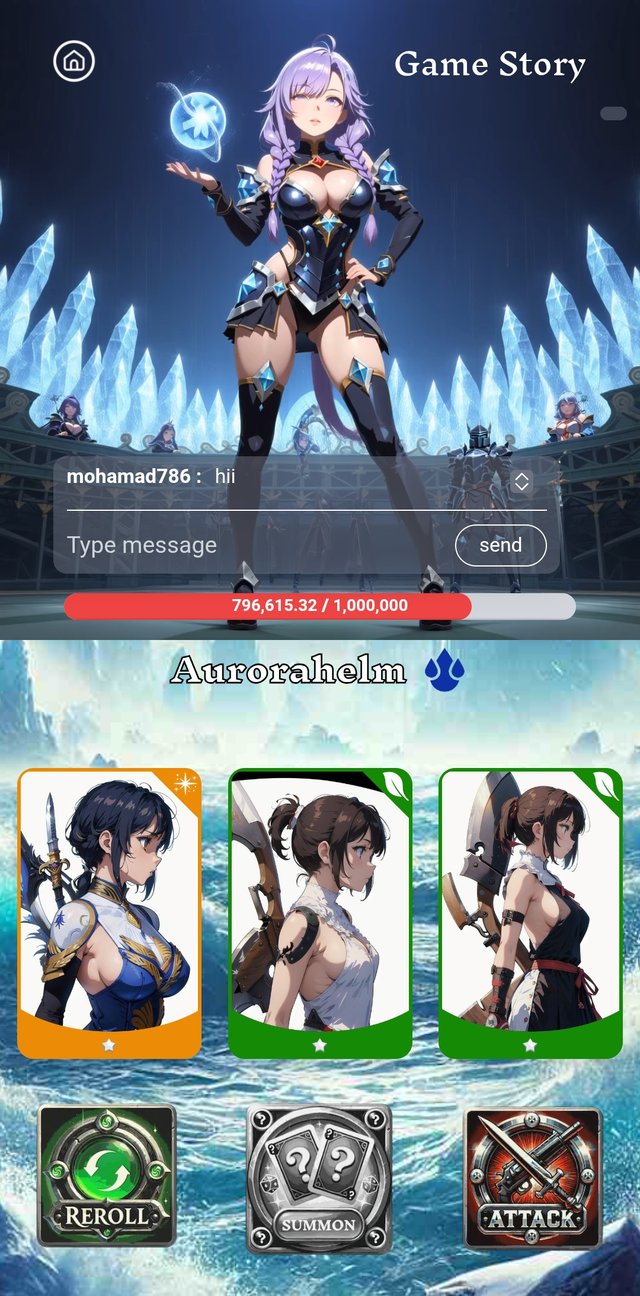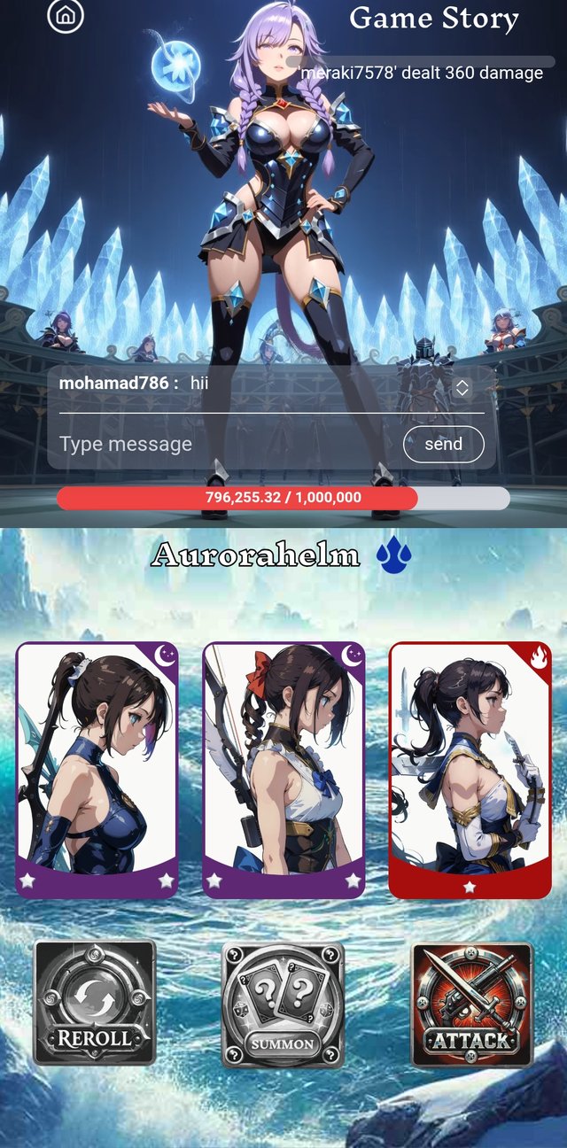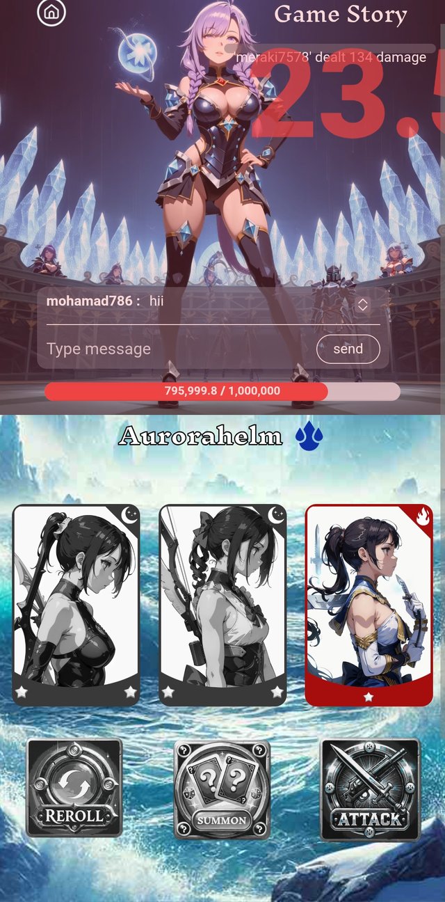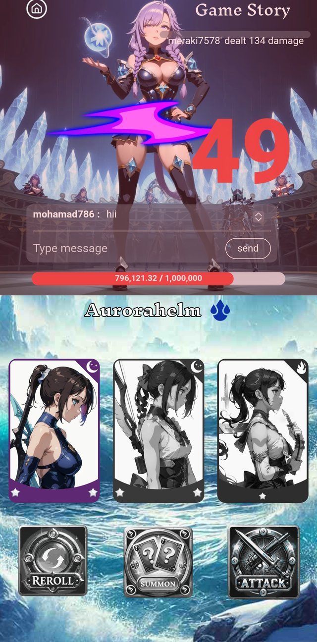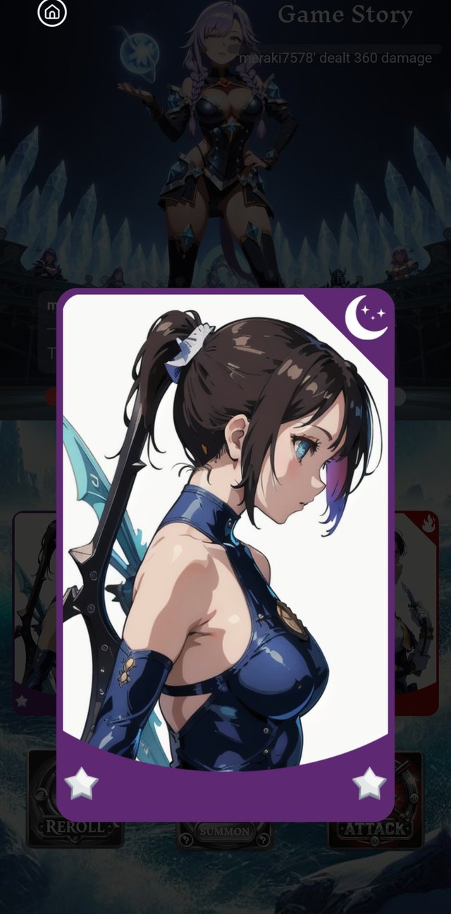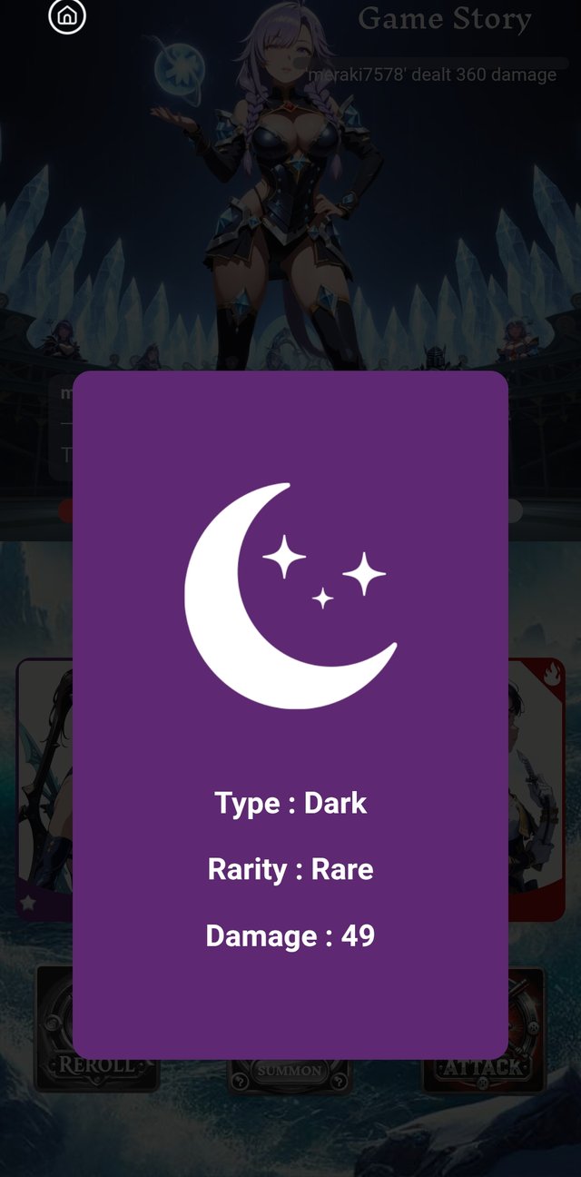 Now, I go to play the game. Then, I go to clicked on summon button.There were 3 cards. But they were not so good for today.Then I cliccked the reroll button. It's type was dark, rarity was rare and damage was 49.