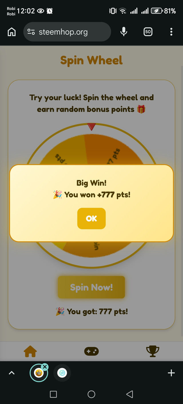 Then go to three dot menu and Spin wheel after spin i got 777 pts.Although yesterday was 777 pts.As like yesterday today also it was big winning.