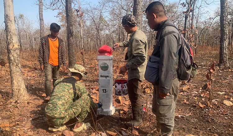 មន្ត្រីកំពុងដំឡើងបង្គោលនៅក្នុងតំបន់អភិរក្សក្នុងព្រៃ។ អង្គការជីវិតធម្មជាតិកម្ពុជា