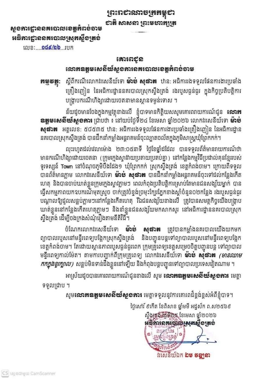 លោកវរសេនីយ៍ឯក ឯម វឌ្ឍនា អធិការនគរបាលស្រុកស្ទឹងត្រង់ បានបញ្ជាក់ថា នៅយប់ថ្ងៃទី២៤ ខែមេសា ឆ្នាំ២០២៦ លោកវរសេនីយ៍ទោ ម៉ាប់ សុផាត បានដឹកនាំកម្លាំងអន្តរាគមន៍ចុះល្បាតចល័ត ក្នុងភូមិសាស្ត្រ ឃុំព្រែកកក់។ លុះរហូតដល់វេលាម៉ោង២៣៖០៥នាទី បានទទួលព័ត៌មានរាយការណ៍ថា មានករណីហិង្សាដោយចេតនា (ក្រុមក្មេងស្ទាវវាយប្រតាយប្រតប់គ្នា) នៅកន្លែងកម្មវិធីប្រដាល់គុនខ្មែររបស់ទូរទស្សន៍ Town នៅចំណុចភូមិបឹងដែង១ ឃុំព្រែកកក់ ស្រុកស្ទឹងត្រង់ ខេត្តកំពង់ចាម។